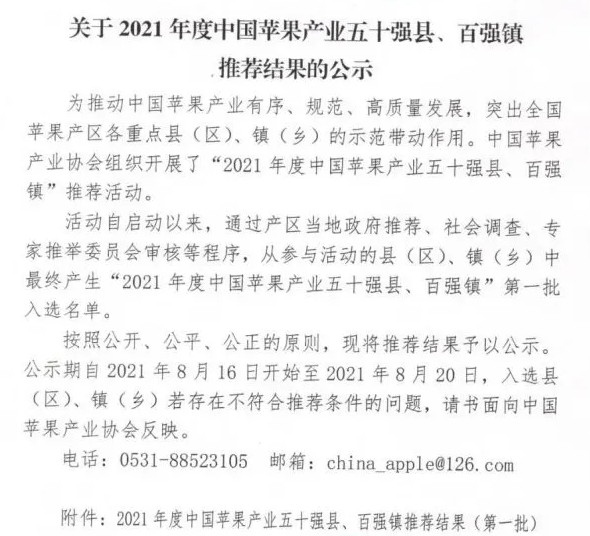 2021年度中国苹果产业百强镇(部分名单)↓