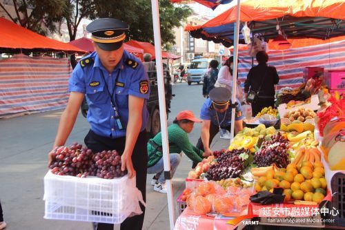 8月25日,在洛川县步行街中段记者看到,平常拥堵零乱的街道,整整齐齐地排列着销售月饼、水果等的商户摊,洛川县城管执法局工作人员正在维持秩序并向商贩耐心地讲解政策。