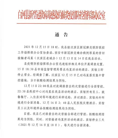 县疫情防控指挥部办公室迅速组织相关单位开展调查处置。15日18:30县市场监督管理局要求冯某活动的酒店、宾馆立即停止营业。经调查了解,汉滨区12月15日已对冯某落实集中管控措施,当目核酸检测结果为阴性。