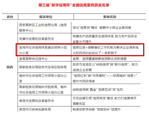 (记者 张超)2月10日,记者从宝鸡市社会信用体系建设领导小组办公室获悉,第三届“新华信用杯”全国信用案例和信用应用场景优秀微视频评选结果揭晓,宝鸡市报送的案例《信用记录+调解催收工作机制为解决企业债务拖欠和民间纠纷创出了一条新路子》获得优秀案例。