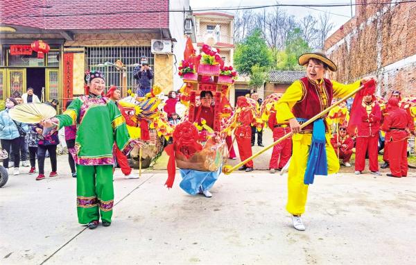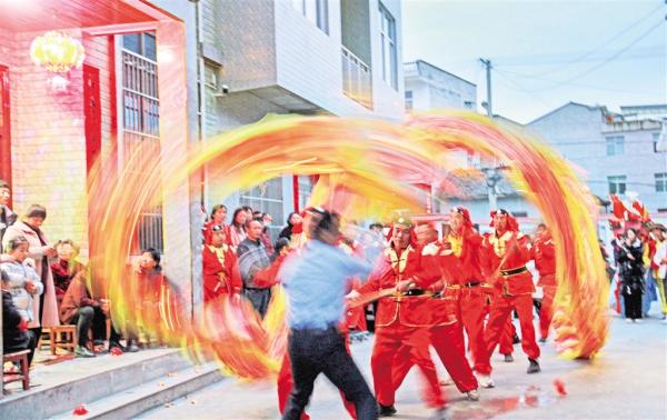 张营村是五里镇的大村之一,全村8个村民小组,357户,1378人。传统文艺节目展演,在张营村已有悠久的历史。以前演出的传统文艺节目主要有舞龙、采莲船和地蹦子表演,该村今年还增加了6个少年表演的彩狮闹春和孙悟空节目。从正月十三开始,表演人员在全村及周边农户和有关单位演出,连续展演三天,直到过了正月十五才结束。 陈德模 摄