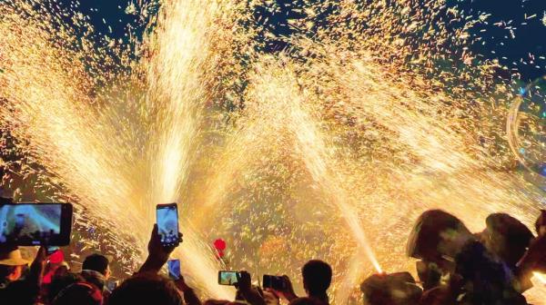 在旬阳蜀河古镇烧狮子的现场,观众纷纷拿出手机记录这精彩一幕。 马卓跞 摄
