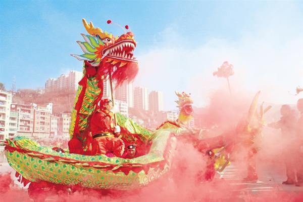 2月14日,旬阳市第一届民间社火展演活动起龙仪式举行,展演队伍从祝尔慷广场出发,活动为期3天。 牛华 摄