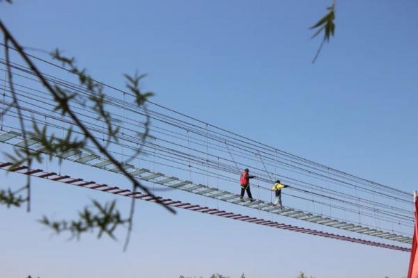 三国小镇的“步步惊心”,看似是一条普通的吊桥,但仔细一看——中间居然是镂空的。一路上,即便安全防护周全,你也依旧会心跳加速!