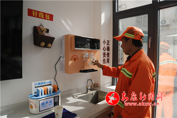 一杯清茶,让环卫工人解了渴;一把椅子,使外卖小哥歇了脚;一个微波炉,助快递员吃上了热乎饭我们夫妻每天打扫完附近街道的卫生后,就会进来休息。在这里,累了我们可以进来歇歇脚,渴了有免费的饮用水可以喝,想热饭有微波炉,一到这里就让我们有一种家的温暖。11月8日,作为这里常客的环卫工人杨大新对初心服务站点赞。